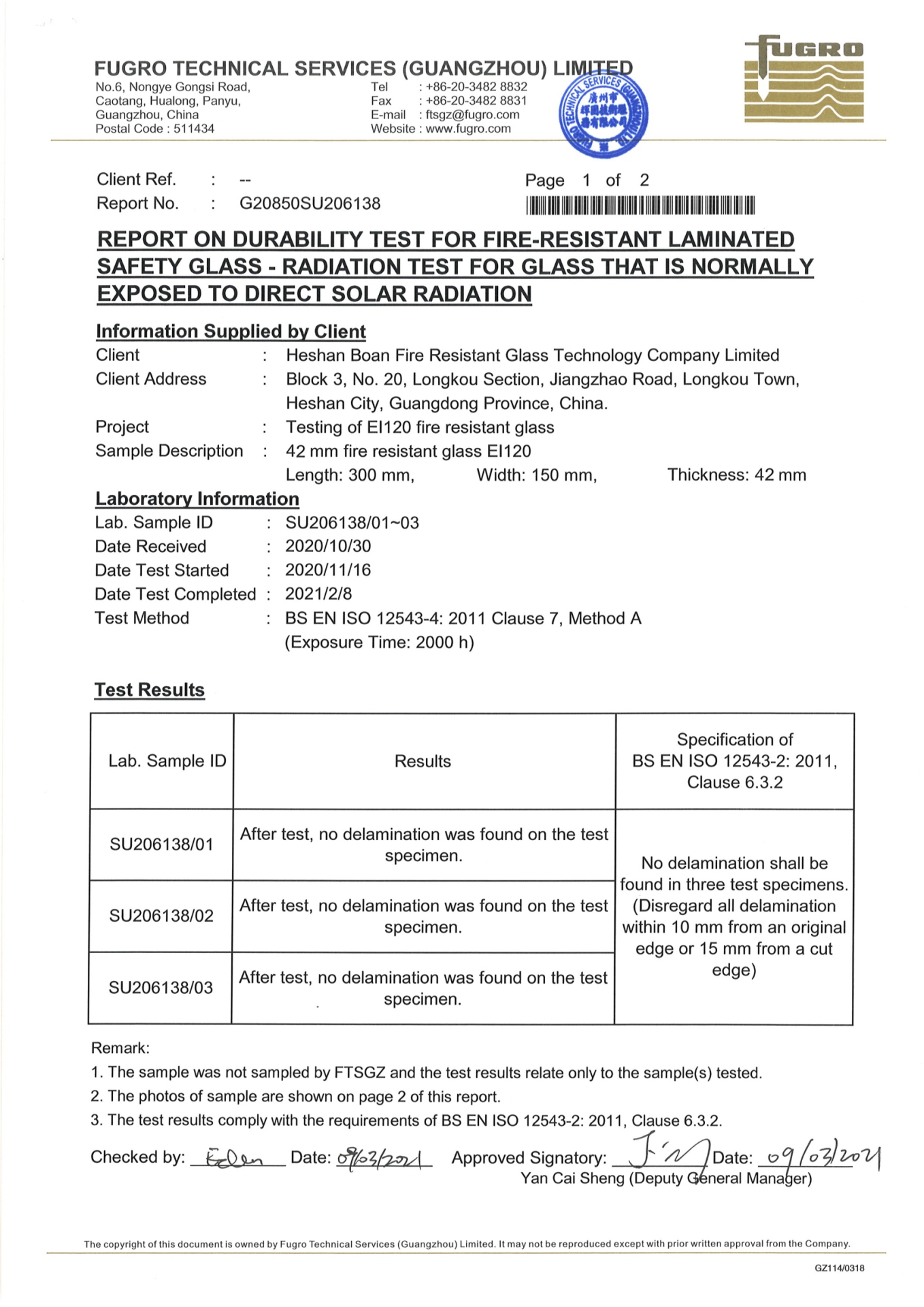 Report On Durability Test For Fire-Resistant Laminated Safety Glass